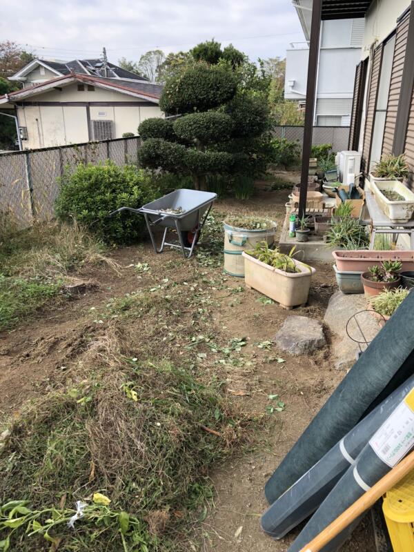 先日、堺市南区にお住まいのお客様から「庭の手入れを楽にしたい」とのご依頼をいただき、防草シート(日光を遮り雑草を防ぐシート)の敷設作業を行いました。