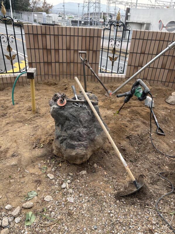 抜根の支障となる大きな庭石や、お庭の象徴である灯篭を慎重に吊り上げ、移動させました。特に灯篭は、一つひとつのパーツを傷つけないよう新しい場所へ運び、改めて据付(石造物を適切な場所に設置する作業)を行いました。