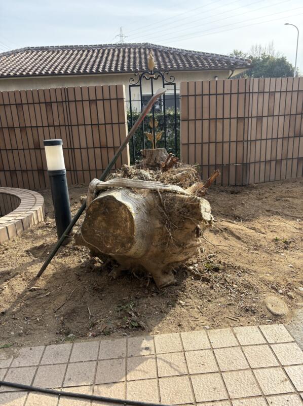• ウバメガシ: 備長炭の原料としても知られるほど密度が高く、非常に硬い木です。根も同様に頑丈で、粘り強いため、慎重な解体作業が求められました。